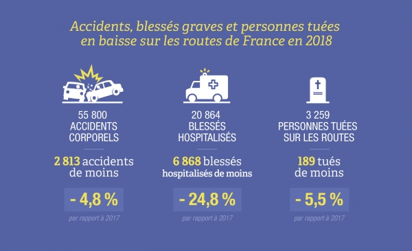 En 2018, 3 259 personnes ont perdu la vie dans un accident de la route en France métropolitaine. Avec 189 décès de moins que l’année 2017, 2018 est l’année la moins meurtrière de l’histoire de la sécurité routière, soit 0,3% de moins qu’en 2013, qui était jusqu’à présent l’année de référence.