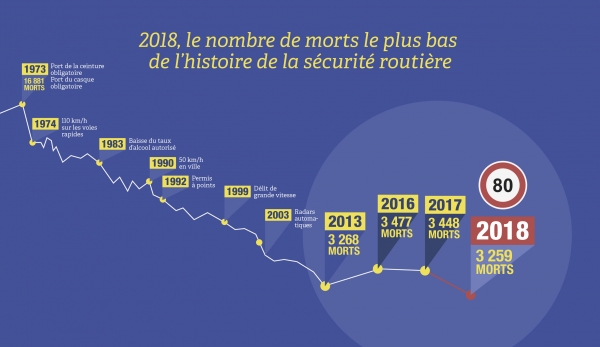 Le 9 janvier 2018, le Premier ministre, Edouard Philippe, avait annoncé 18 mesures fortes dont la mise en place de la baisse de la vitesse autorisée de 90 à 80 km/h sur les routes à double-sens sans séparateur central à compter du 1er juillet 2018. Cette décision a été prise sur la base des recommandations des experts du CNRS (Conseil National de la Sécurité Routière) qui ont estimé entre 300 et 400 vies épargnées par an.