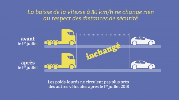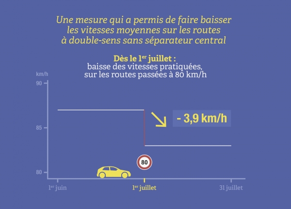 - Sur le réseau passé à 80 km/heure, la vitesse pratiquée a chuté dès le dimanche 1er juillet : de – 3,9 km/h pour les véhicules légers et de – 1,8 km/h pour les poids lourds. Elle s’est ensuite stabilisée pour les véhicules légers et a légèrement ré-augmenté pour les poids-lourds.